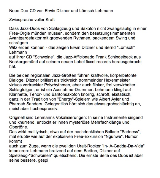 Ditzner Lömsch DUO CD Kritik Veröffentlicht 3. November 2011 in 539 × 600 in Presse ← Zurück Weiter → Sowohl Kommentare, als auch Trackbacks sind geschlossen.